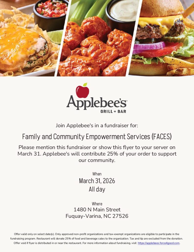 Visit Applebee’s for a meal anytime during the hours of 11 am – 11 pm and mention that you are supporting FACES. 25% of your ticket cost will be donated to help support the FACES Community Response Program, to help support residents of Fuquay-Varina and Willow Spring, NC.